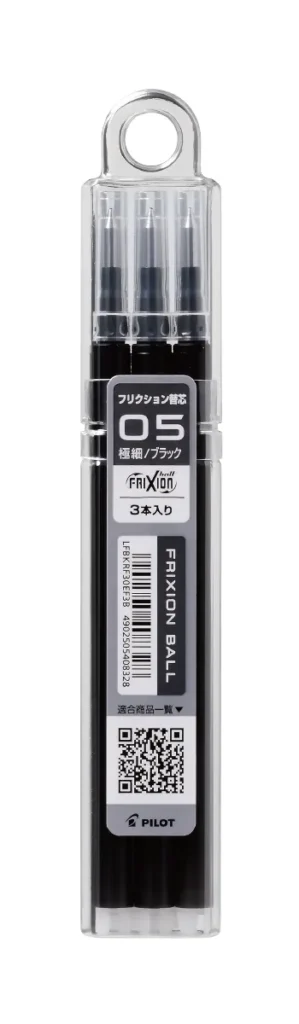 フリクションの替え芯の箱には、適合商品一覧のQRコードがのっており、基本的にはボディと適合したリフィルを交換する形になります。