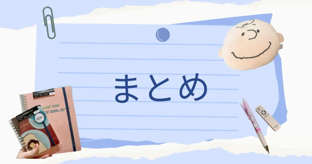まだ手帳やノートを続ける習慣がない方は、「開けばOK」「時間がないときは5分だけ書く」など、ハードルを低く設定するのがおすすめです。